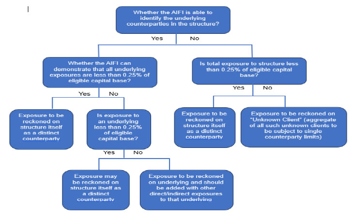 Note: (a) Exposure to underlying 8 (which is less than 0.25 per cent of eligible capital base) may be counted as exposure on structure itself. Consequently, for underlying 8 total exposure to underlying will be 15.00 per cent or 15.20 per cent at the option of the AIFI. (b) Had the AIFI been not able to identify underlying exposures, entire exposure to the structure (i.e. 100, which is greater than 0.25 per cent of eligible capital base) would be exposure on 'unknown client'. All such unknown clients would be treated as a single counterparty and single counterparty limit would apply on aggregate exposure to all such unknown clients. 30. The AIFI shall be permitted to assign the exposure amount to the structure itself, defined as a distinct counterparty: Provided that it can demonstrate that the AIFI's exposure amount to each underlying asset of the structure is smaller than 0.25 per cent of its eligible capital base, considering only those exposure to underlying assets that result from the investment in the structure itself and using the exposure value calculated according to paragraphs 35 and 36. In this case, an AIFI is not required to look through the structure to identify the underlying assets. 31. The AIFI shall look through the structure and in the case of underlying assets for which the underlying exposure value is equal to or above 0.25 per cent of its eligible capital base, the counterparty corresponding to each of the underlying assets shall be identified so that these underlying exposures can be added to any other direct or indirect exposure to the same counterparty. The AIFI's exposure amount to the underlying assets that are below 0.25 per cent of the AIFI's eligible capital base shall be assigned to the structure itself (i.e., partial look-through is permitted). 32. If the AIFI is unable to identify the underlying assets of a structure: (1) where the total amount of an AIFI's exposures to a structure does not exceed 0.25 per cent of its eligible capital base, it shall assign the total exposure amount to the structure itself, as a distinct counterparty. (2) Otherwise (i.e., if the exposure to the structure equals or exceeds 0.25 per cent of its eligible capital base), it shall assign this total exposure amount to the 'unknown client'. Provided that the exposure limits shall apply on the aggregate of all such exposures to 'unknown clients' as if they are a single counterparty. 33. Where the LTA is not required (paragraph 30 above), the AIFI shall demonstrate that regulatory arbitrage considerations have not influenced the decision whether to look through or not – e.g. that the AIFI has not circumvented the exposure limits by investing in several individually immaterial transactions with identical underlying assets. 34. If LTA need not be applied, an AIFI's exposure to the structure shall be the nominal amount it invests in the structure. 35. Any structure where all investors rank pari passu (e.g., CIU): When the LTA is required according to the sections above, the exposure value assigned to a counterparty is equal to the pro rata share that the AIFI holds in the structure multiplied by the value of the underlying asset in the structure. Thus, an AIFI holding a ₹1 investment in a structure, which invests in 20 assets each with a value of ₹5, shall assign an exposure of ₹0.05 to each of the counterparties. An exposure to such counterparty shall be added to any other direct or indirect exposures the AIFI has to that counterparty. 36. Any structure with different seniority levels among investors (e.g., securitisation vehicles): When the LTA (in terms of sections above) is required for an investment in a structure with different levels of seniority, the exposure value to a counterparty shall be measured for each tranche within the structure, assuming a pro rata distribution of losses amongst investors in a single tranche. To compute the exposure value to the underlying asset, an AIFI shall: (1) first, consider the lower of the value of the tranche in which the AIFI has invested and the nominal value of each underlying asset included in the underlying portfolio of assets (2) second, apply the pro rata share of the AIFI's investment in the tranche to the value determined in the first step above. 37. Identification of additional risks: (1) While taking exposures to structures, an AIFI shall identify such third parties which may constitute an additional risk factor, and which are inherent in the structure itself rather than in the underlying assets. Such a third party could be a risk factor for more than one structure that the AIFI invests in. Examples of roles played by third parties include originator, fund manager, liquidity provider and credit protection provider. The RBI as a part of its Pillar 2 supervisory review and evaluation process will look into this aspect and if required specify a specific course of action which may either include reduction in exposure or raising of additional capital. (2) It is conceivable that an AIFI may consider multiple third parties to be potential drivers of additional risk. In this case, the AIFI shall assign the exposure resulting from the investment in the relevant structures to each of the third parties. G. Exposures to NBFCs 38. An AIFI's exposure to NBFCs (excluding refinance exposure) shall be subject to the single and group of connected counterparty limits prescribed in paragraphs 11 and 12. H. Exposures to Central Counterparties 39. An AIFI's clearing exposure to QCCPs shall be exempt from the large exposures framework. However, these exposures shall be subject to the regulatory reporting requirements as prescribed in paragraph 48. 40. In the case of non-QCCPs, the AIFI shall measure its exposure as a sum of both the clearing exposures described in paragraph 42 and the non-clearing exposures described in paragraph 43, and the same shall be subject to the large exposure limit of 25 per cent of the eligible capital base. 41. The con