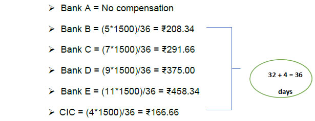 Explanation: The delay of six days shall be apportioned by the CIs/CICs on weighted average of the extent of delay by each CIs/CICs. In the above case, the overall delay is 6 days and therefore the complainant shall be entitled for total compensation of ₹600. This needs to be apportioned between all the defaulting banks (in this case Bank B, C, D and E). Cumulatively, the delay of all the defaulting banks put together is 32 days (5+7+9+11 days). Therefore, the compensation amount of ₹600 shall be apportioned on weighted average of the delay by each CIs in relation to the overall delay of 32 days in this case.
